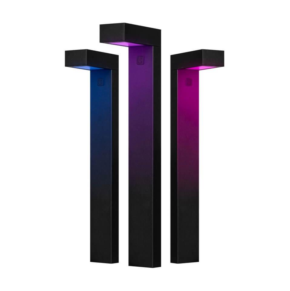 Slimme verlichting voor in de tuin of langs de oprit. Met de 16 miljoen kleuren en de dimfunctie heb je altijd de juiste sfeer in je tuin. Deze complete set bestaat uit 3 slanke sokkels.