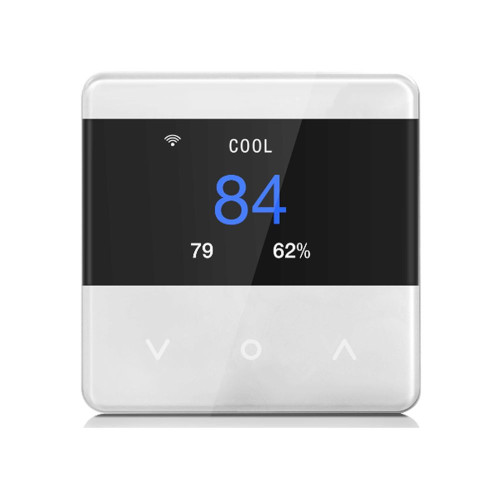 Slimme thermostaat in wit voor bediening van een fancoil (lucht)verwarmingsunit waarmee je kunt koelen en verwarmen. Maak slanke verwarmingsschema's om de ruimte alleen te verwarmen/koelen als dat gewenst is.